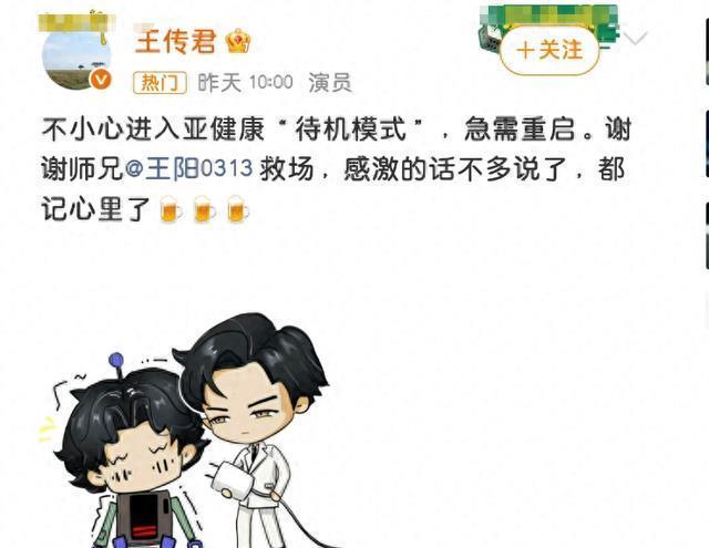 在阅读此文之前,辛苦您点击一下“关注”,既方便您进行讨论和分享,又能给您带来不一样的参与感,感谢您的支持! 心愉 编辑丨 九九 12月17日上午,王传君社交媒体发文称自己因病退出剧组的工作,文案语气非常轻松说自己: “一不小心进入亚健康待机模式,急需重启。”